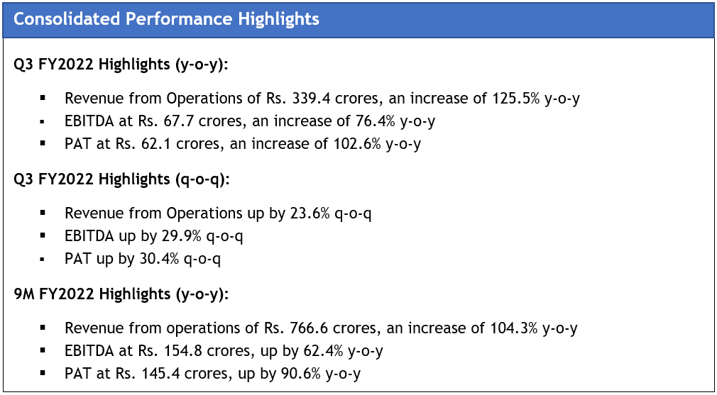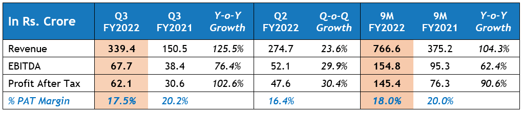 For 9M FY2022, consolidated revenue was at Rs. 766.6 crores, an increase of 104.3% y-o-y. EBITDA was at Rs. 154.8 crores, an increase of 62.4% y-o-y. PAT increased by 90.6% y-o-y to Rs. 145.4 crores and PAT margin stood at 18.0%.